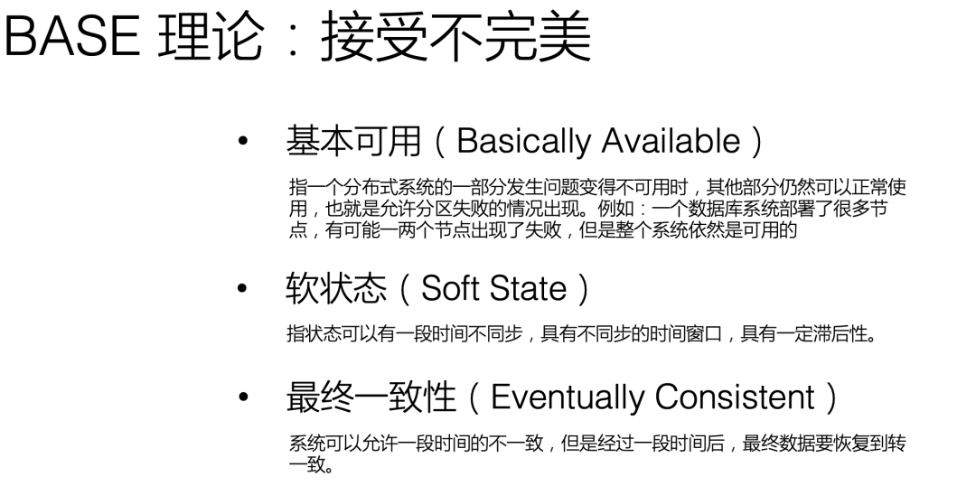 但是,牺牲一致性并不意味着完全放弃它。所谓牺牲,是指在一段时间内,系统可以暂时不保证一致性,但最终还是要恢复到一致性状态,通常被称为最终一致性。基于最终一致性模型,BASE理论提出了一套实践理论,从基本可用性、软状态和最终一致性三个方面来指导我们进行分布式系统设计。