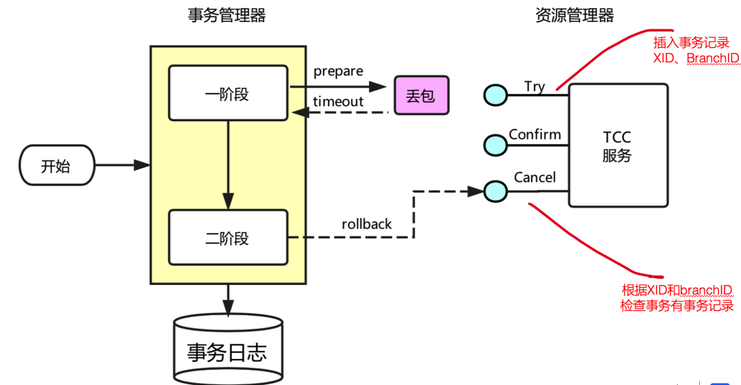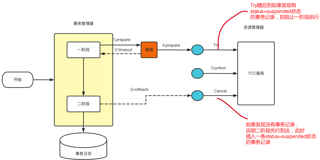 在图示中,当事务协调器调用TCC服务的一阶段Try操作时,由于网络拥堵等原因,可能会出现超时的情况。此时,事务管理器会触发二阶段回滚,调用TCC服务的Cancel操作,但Cancel调用未超时。之后,被网络拥堵延迟的一阶段Try数据包被TCC服务收到,导致二阶段Cancel请求比一阶段Try请求先执行,这会导致TCC服务在执行晚到的Try之后,永远不会再收到二阶段的Confirm或Cancel请求,从而导致TCC服务悬挂的情况。