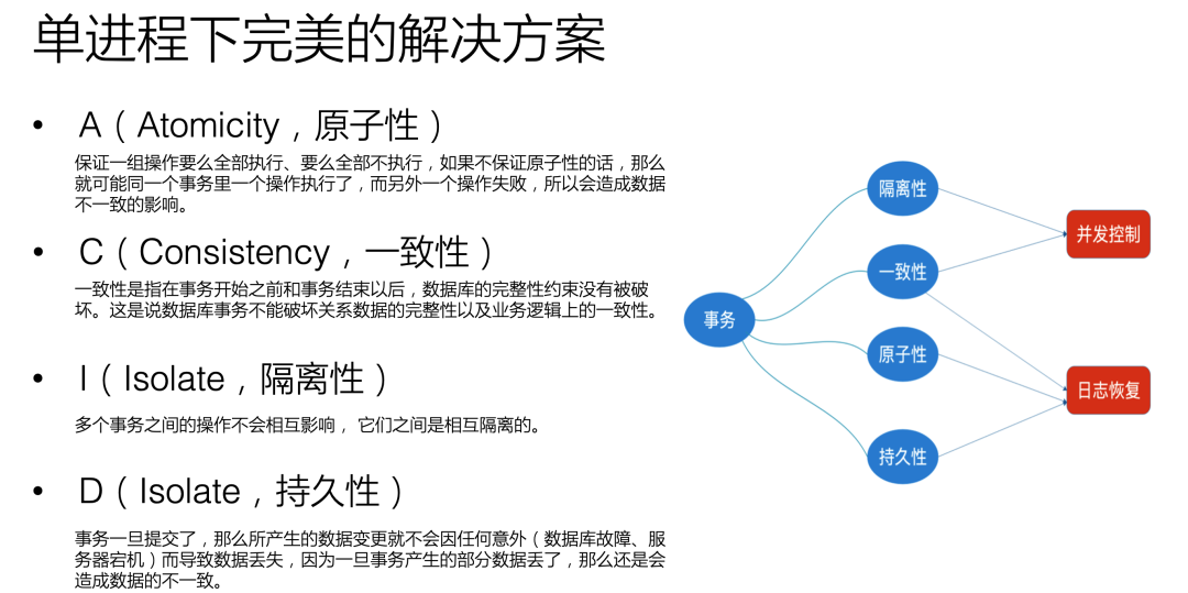 单机事务实现采用ACID模型,通过加锁实现对需要操作相同数据的事务进行隔离,保证事务之间的操作不会相互影响,从而实现了隔离性。在事务提交之前,记录数据修改前的日志(undo log)和事务需要变更数据的日志(redo log),以保证事务不论在哪个阶段都能通过undo log对事务数据进行回滚,把数据恢复到事务开始之前的状态。同时,通过redo log保证事务在提交后,即使数据库或服务器出现故障,也能重做未成功写入磁盘的数据,实现了事务的持久性和原子性。