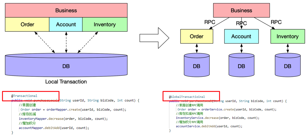 从图中以及代码中可以看到,在分布式事务场景下,只需要在发起方的方法上面添加注解@GlobalTransaction注解就可以了,完全不「干扰」业务的逻辑。