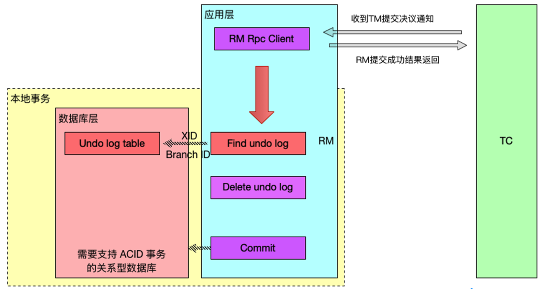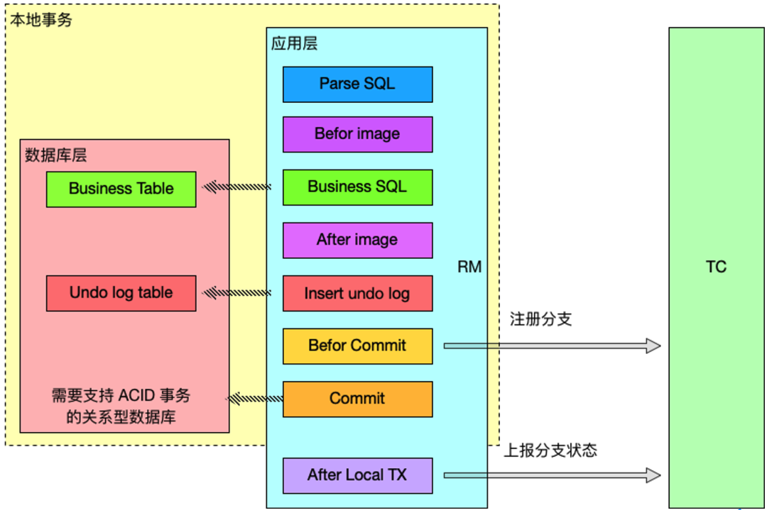 可以看出,AT 模式遵循 TC、TM、RM 交互: