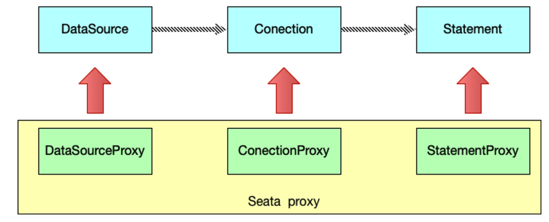 前面在将为什么无侵入的时候讲到,Seata 在数据源做了一层代理层,所以我们使用 Seata 时,我们使用的数据源实际上用的是 Seata 自带的数据源代理 DataSourceProxy。