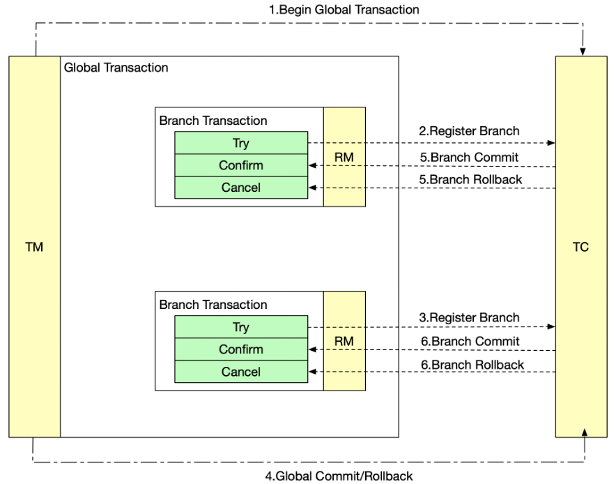 其中TM负责开启全局事务,参与者执行try方法时会注册分支事务,TM决议全局事务提交或回滚后,TC协调者会驱动全局事务内的参与者进行提交或者回滚。