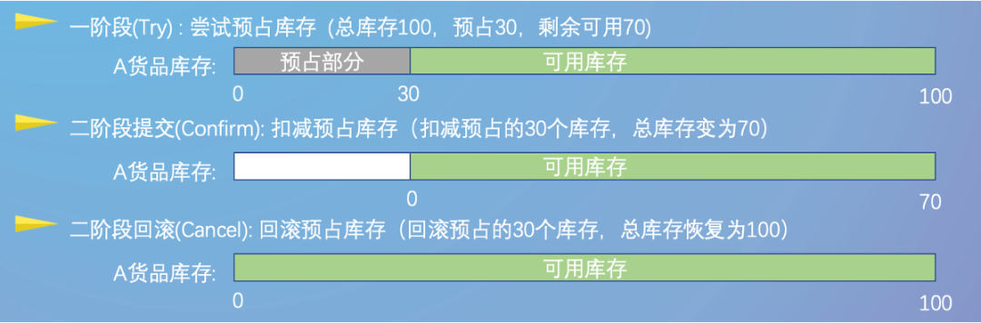 2、具备隔离性: 通过隔离资源达到事务隔离的目的,先预留资源,再真正使用资源,避免了出现两个事务并发时可能导致的同一个资源被使用多次的问题,适合资源敏感的场景。
