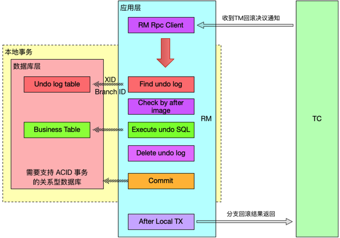 当 TM 决议全局回滚时,RM 收到 TC 发送的回滚请求,RM 通过 XID 找到对应的 undo log 回滚日志,然后执行回滚日志完成回滚操作。