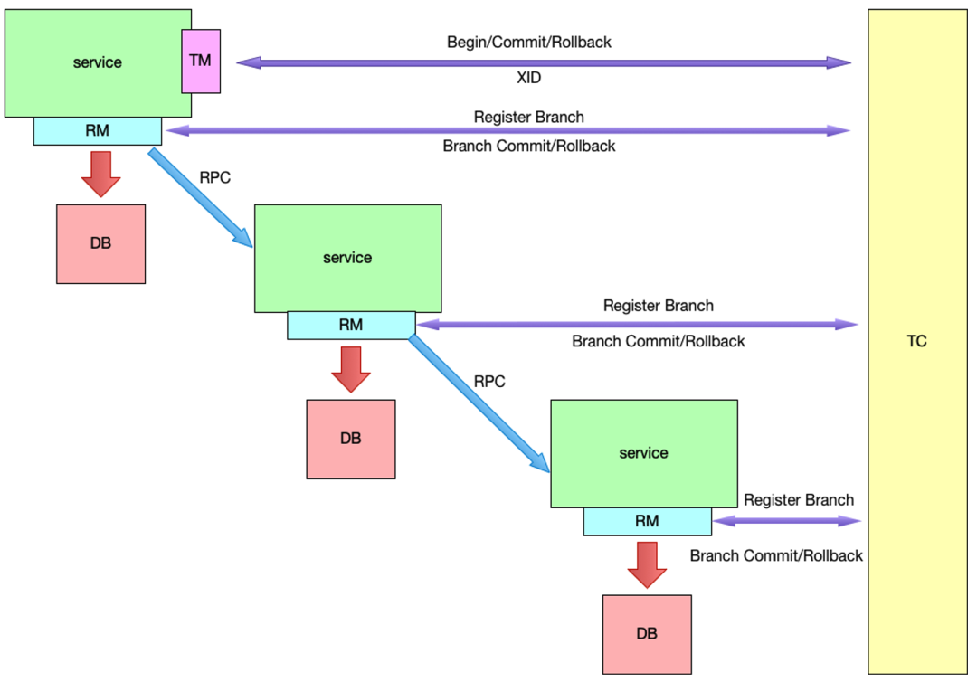 比如从图中看到,假设在RPC调用过程中,其中有一个RPC调用异常了,我们怎么去回滚前面两个已经执行成功的事务呢?
