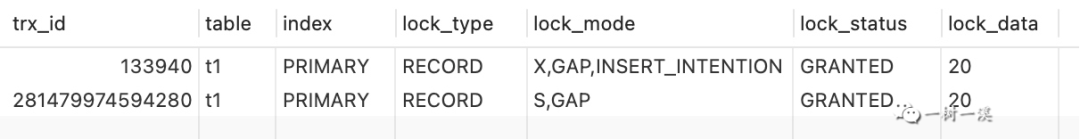 session 1的 SELECT 语句持有间隙锁(lock_mode 包含GAP)。 -