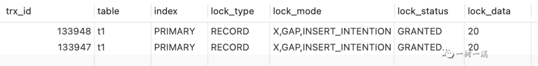 还有一种方式,只能看到正在等待的插入意向锁,无法看到已经获得的插入意向锁。