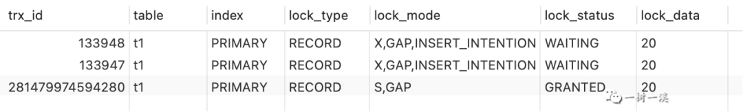 由于 id = 20 的记录前面的间隙被第 1 步的 SELECT 语句锁住了,第 2、3 步的 INSERT 语句正在等待该间隙的插入意向锁。