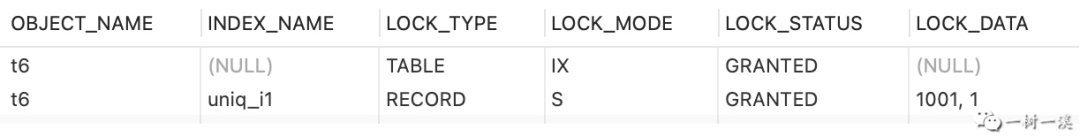唯一索引(uniq_i1):id = 1,i1 = 1001 的记录,加 next-key 共享锁。