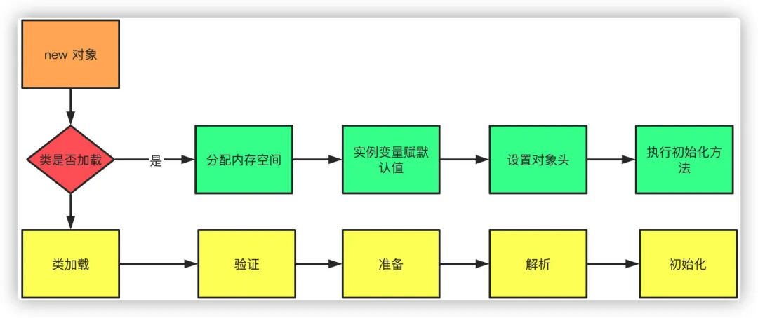 当虚拟机遇见new关键字时候,实现判断当前类是否已经加载,如果类没有加载,首先执行类的加载机制,加载完成后再为对象分配空间、初始化等。