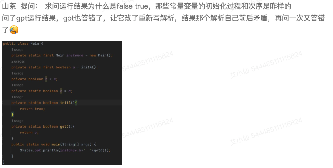 问题其实出现在代码顺序上,第一行代码就是去 new 一个静态的 Main 实例对象,但是这里代码顺序先去初始化 instance ,但是此时代码 a 的定义写在 instance 之后,所以初始化 instance 对象的时候其实 a 还没有赋值,所以给 b 赋值的时候就是 false。