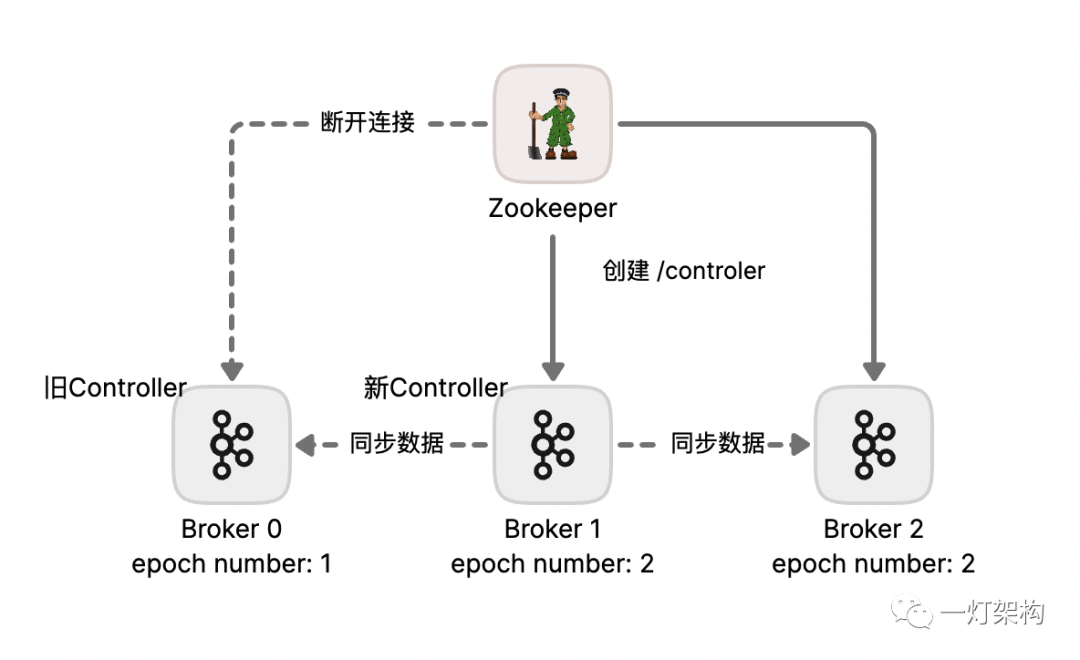 Broker 1和Broker 2同时尝试在ZooKeeper中创建/controller节点,假设Broker 1成功了,那么它就成为了新的Controller,设置epoch number值为2,并向Broker 2同步数据。 -