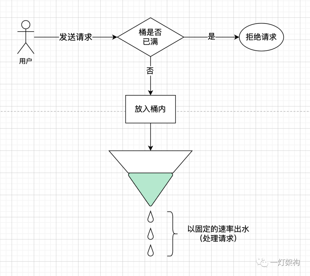 当流入水(请求数量)的速度过大会直接溢出(请求数量超过限制则直接拒绝)。 -
