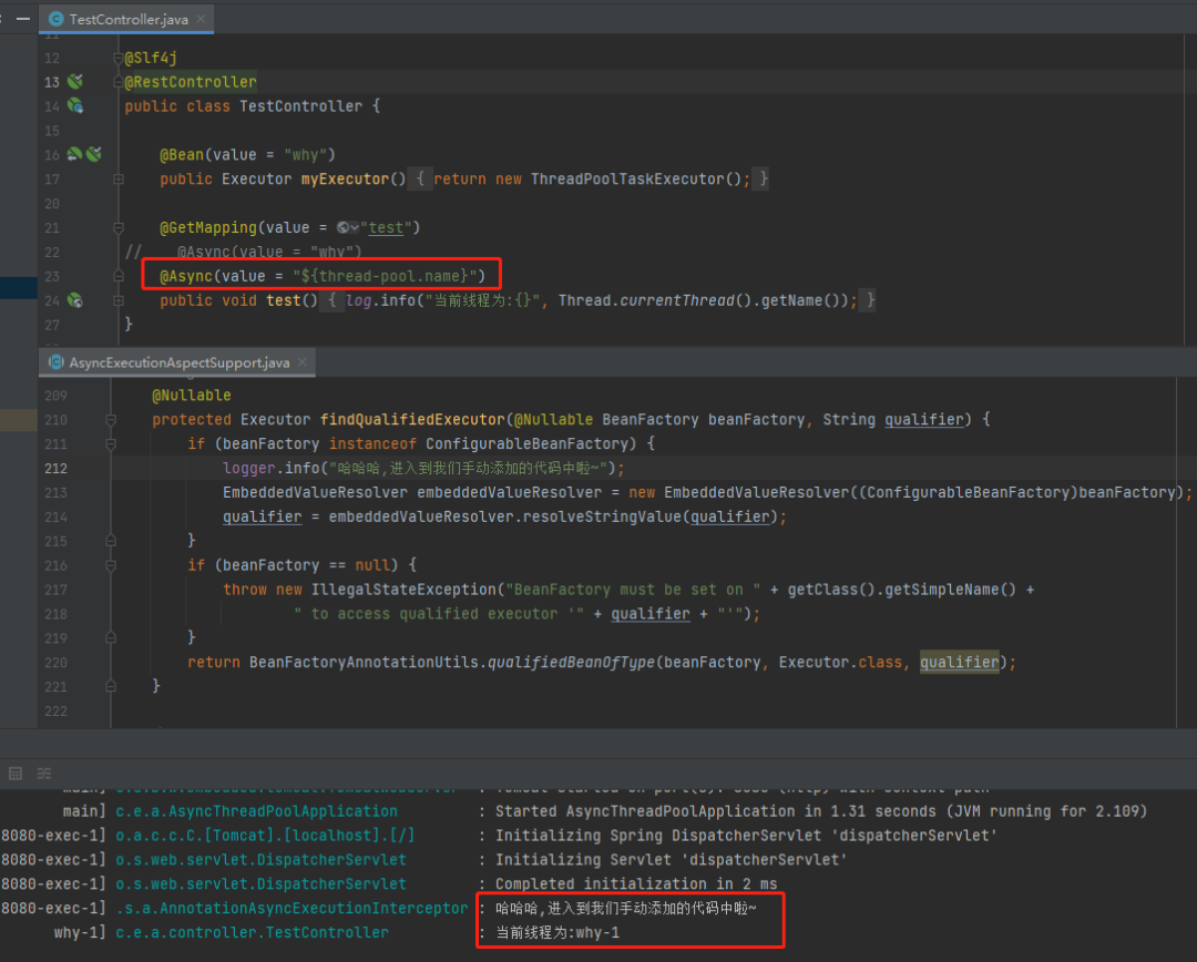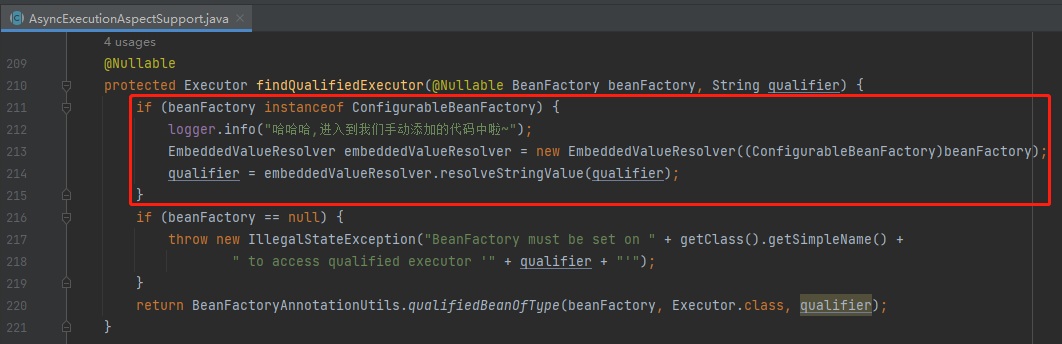 在文章里面,经过分析,我们知道只需要在 org.springframework.aop.interceptor.AsyncExecutionAspectSupport.findQualifiedExecutor(BeanFactory,String) 这个方法中,加入这几行代码就行了: