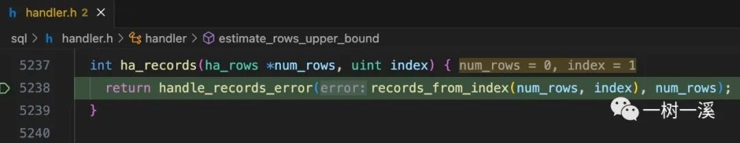 程序执行到 ha_records() 方法时,我们可以看到,index 参数的值是 1,这就是执行计划确定要使用的索引 ID。