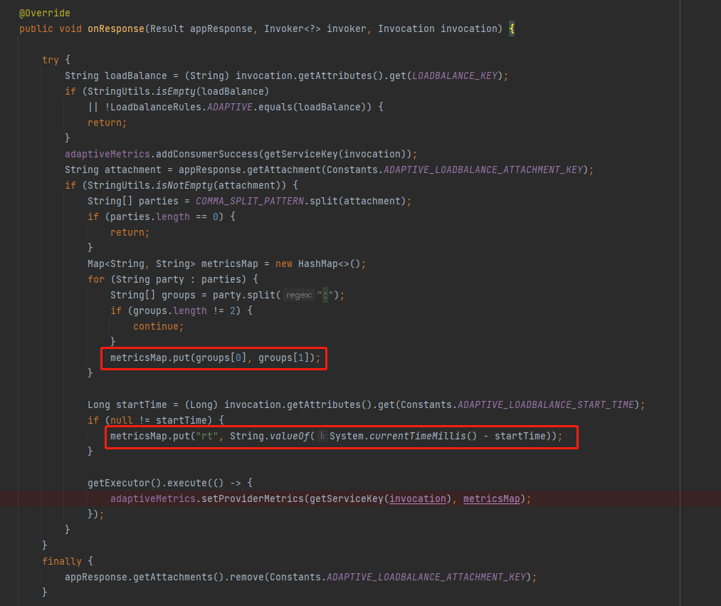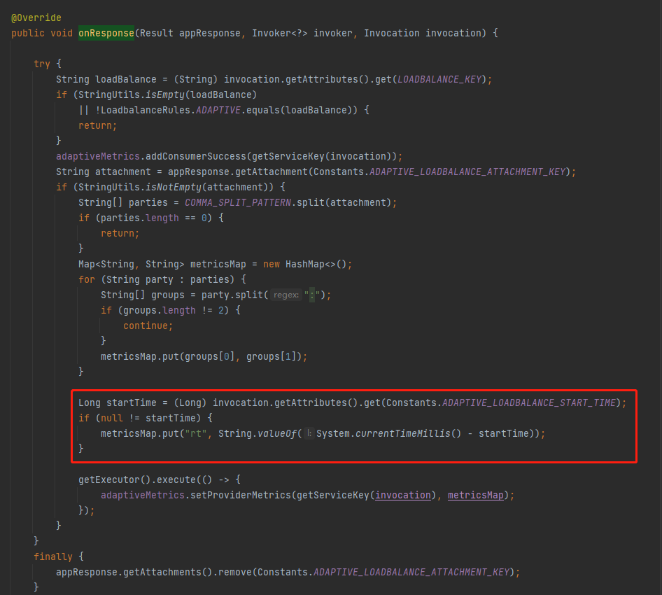 在 AdaptiveLoadBalanceFilter 里面的 onResponse 方法里面,当收到服务端的响应之后,在这里取出了 startTime 用来计算 rt 值。