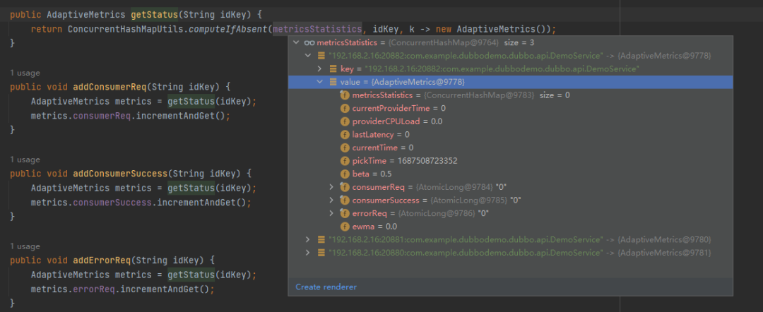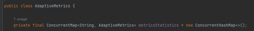 首先 getStatus 方法是获取一个 AdaptiveMetrics 对象。这个对象里面有一个 ConcurrentHashMap,内容是这样的: