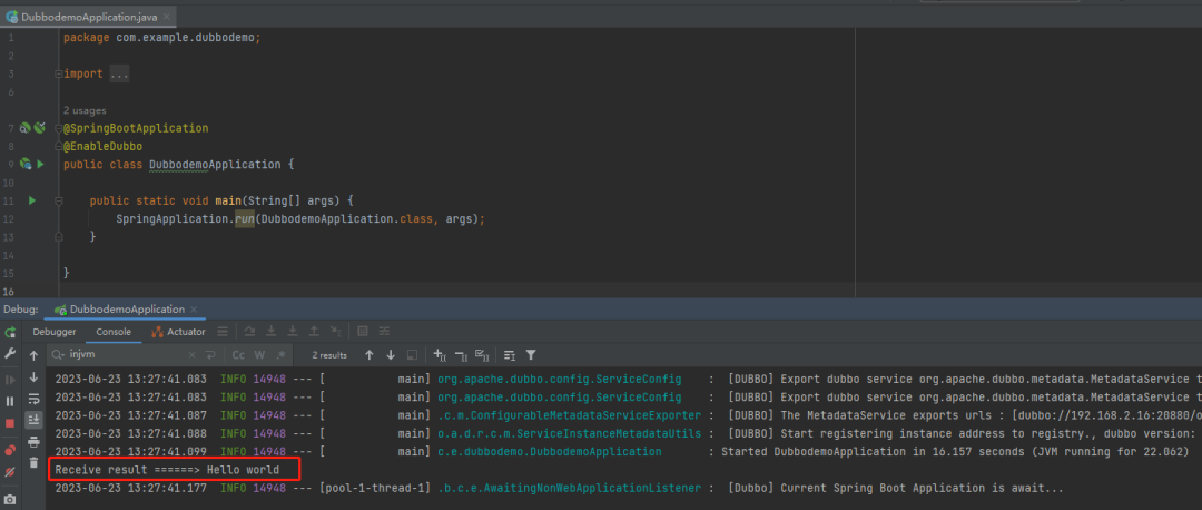 因为在 Demo 里面使用的是 injvm 协议,也就是本地调用: