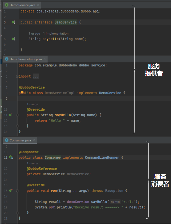 一个提供者,一个消费者。消费者继承了 CommandLineRunner 接口,在服务启动完成之后会自动去触发一次服务调用:
