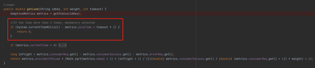 假设超时时间是 5s,那么当这个服务端距离上次被选中的时间超过 10s,则返回 0,既表示无负载。