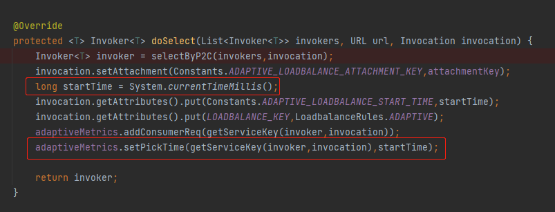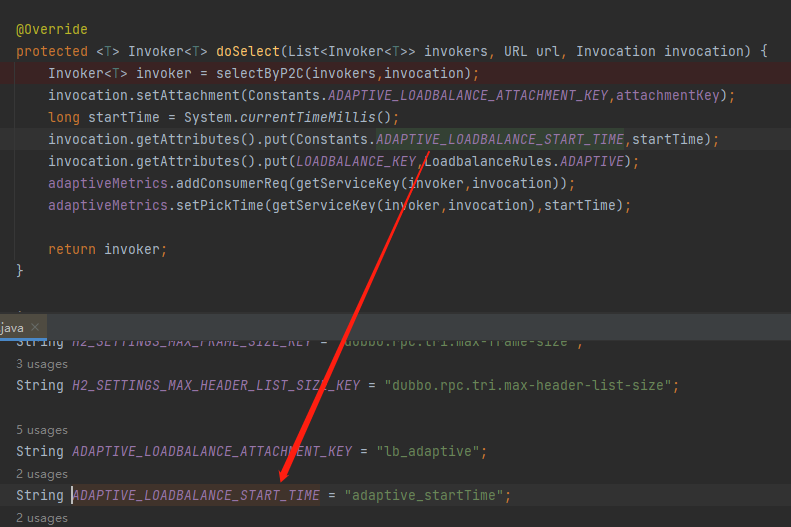 在这里我们可以看到,它从上下文中取出了 ADAPTIVE_LOADBALANCE_ATTACHMENT_KEY 变量,判断是否为空。