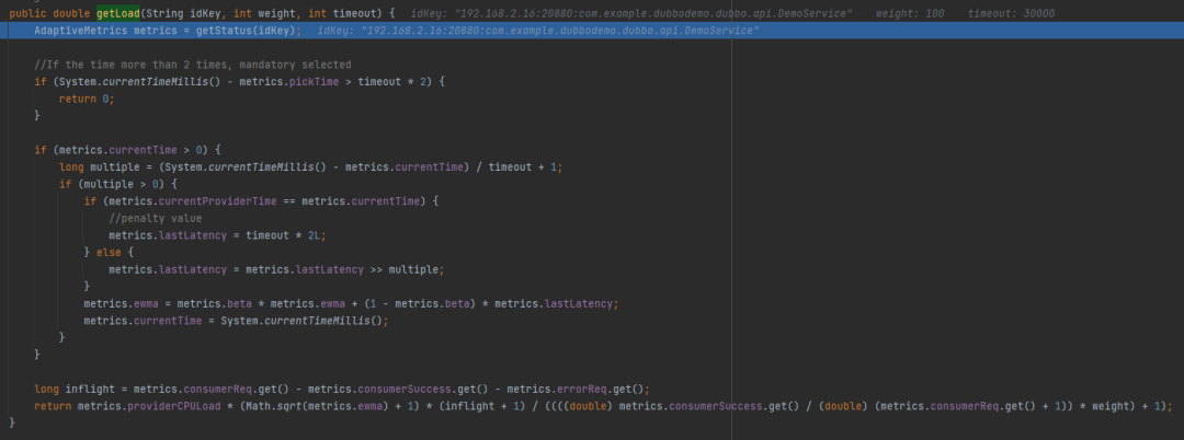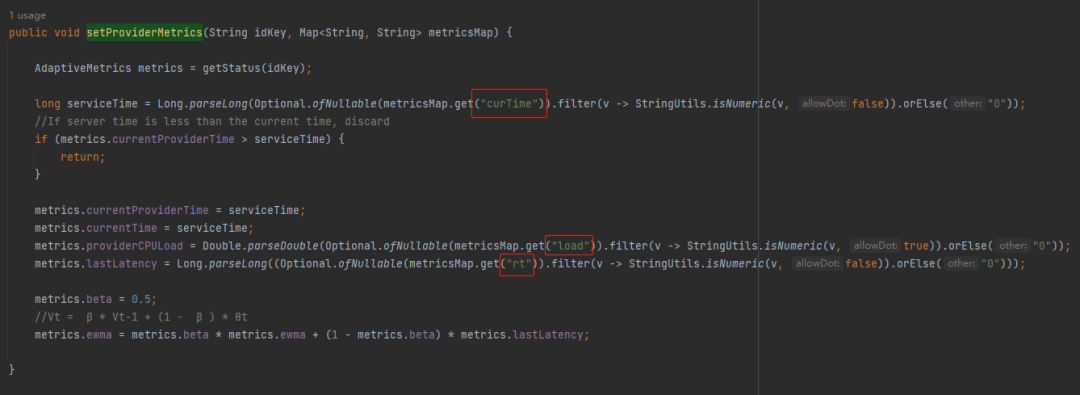 ewma:是在 setProviderMetrics 方法里面维护的,其中 lastLatency 是在 ProfilerServerFilter 的 onResponse 方法中经过计算得到的 rt 值。 -