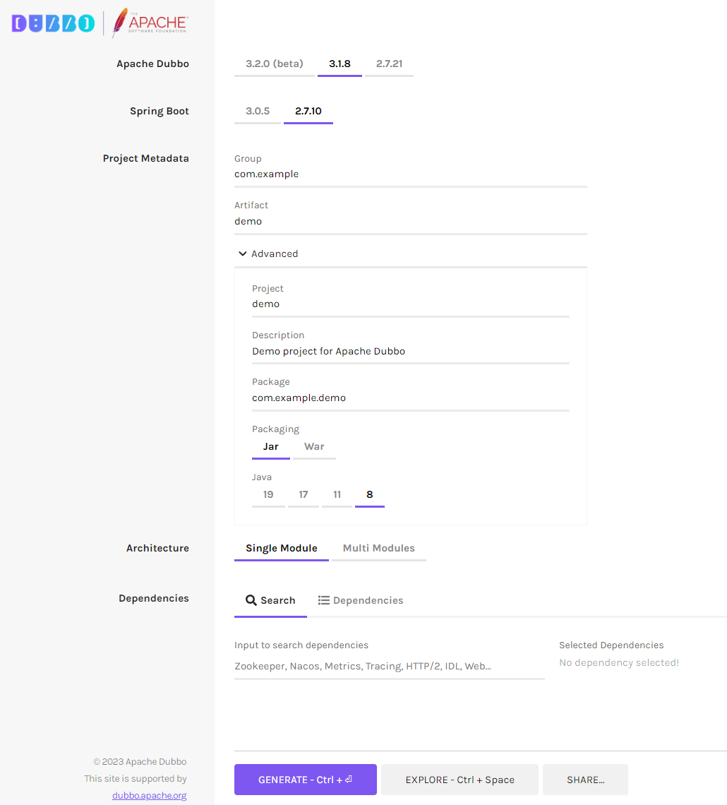 https://start.dubbo.apache.org/bootstrap.html