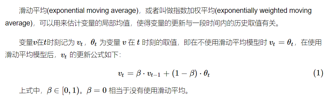 第一次看到的时候我也是懵的,我也不知道,所以我查了一下,这是指数加权平均(exponentially weighted moving average),简称 EWMA,可以用来估计变量的局部均值,使得变量的更新与一段时间内的历史取值有关。