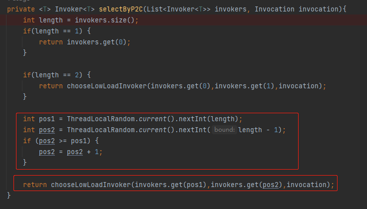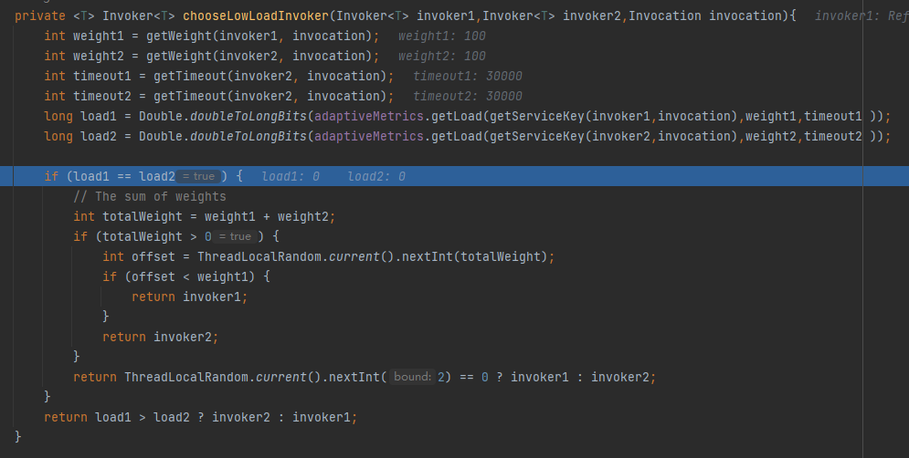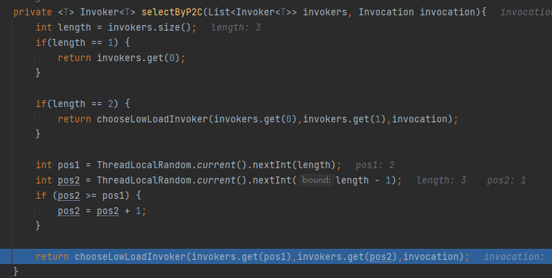 逻辑就来到了 chooseLowLoadInvoker 方法里面。从方法名可以知道,是要选择负载比较低的那个。
