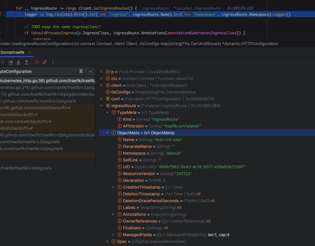 这里 DEBUG 可以看到我们日志的 IngressRoute 的信息。