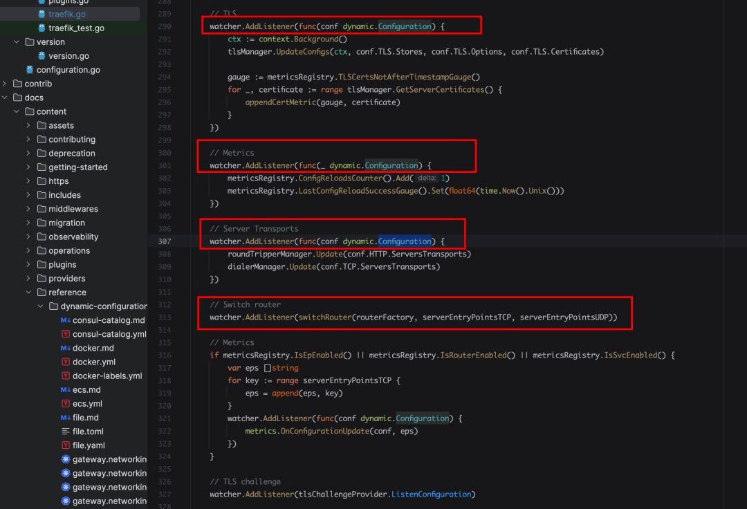 这里的 watcher 也是一个关键点,添加了关于 TLS、Metrics、Server Transports 和 Switch Router 的动态配置的监听。