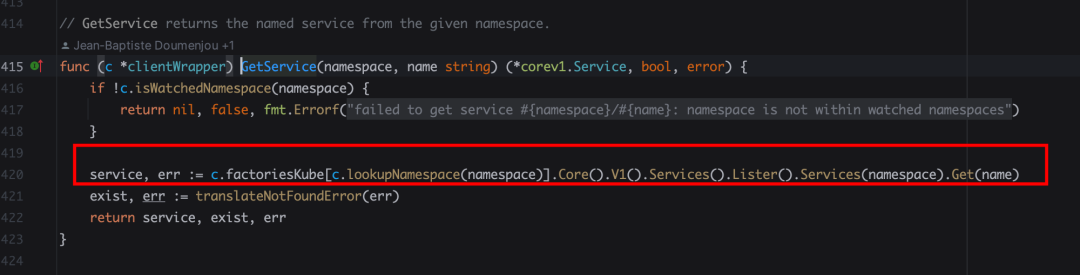 进入这个方法可以看到其实就是通过 K8S 的客户端去调用 API 接口,获取到了 service 的信息,还有端口、后端服务的地址。