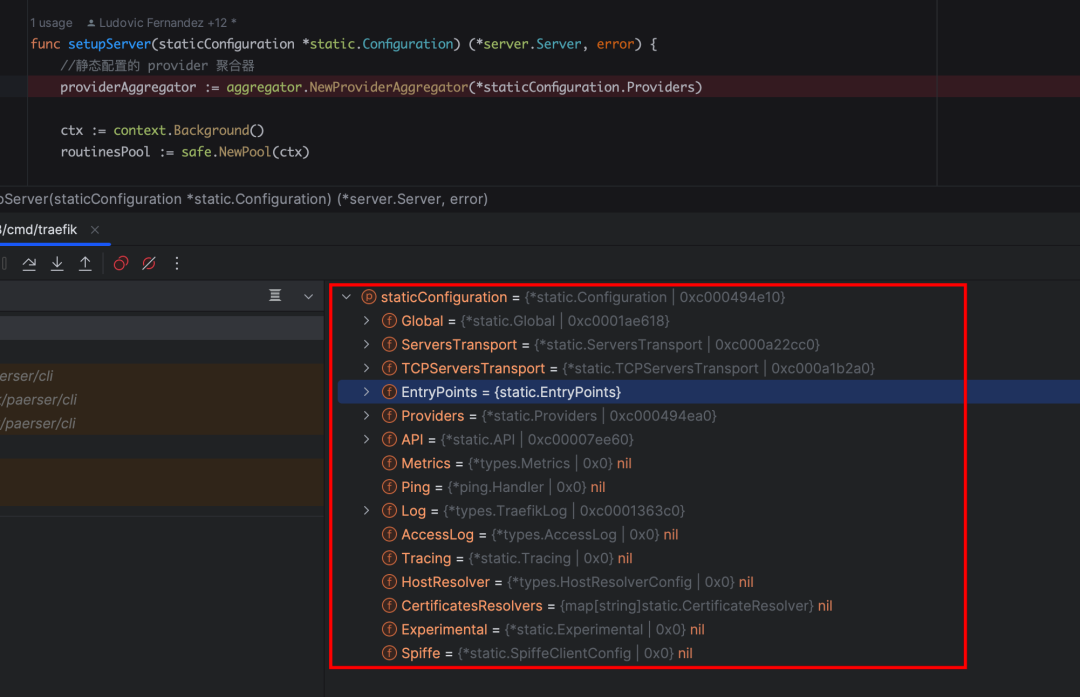 这里可以看一下静态配置到底都有些什么东西,因为我们没有配置 AcessLog、Metric 这些东西,所以都是空的,其实关键就两个东西,一个是 EntryPoints,另外一个是 Provider。