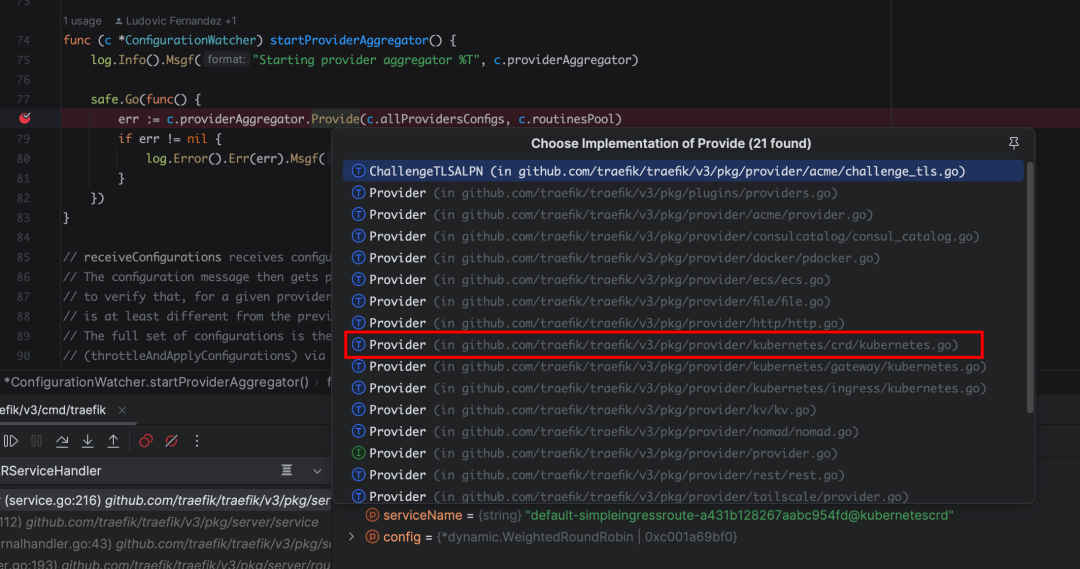 provider 的聚合器是根据不同的 provider 提供了不同的实现,这里我们是使用 K8S CRD 的方式,所以待会儿进去看这个实现即可。