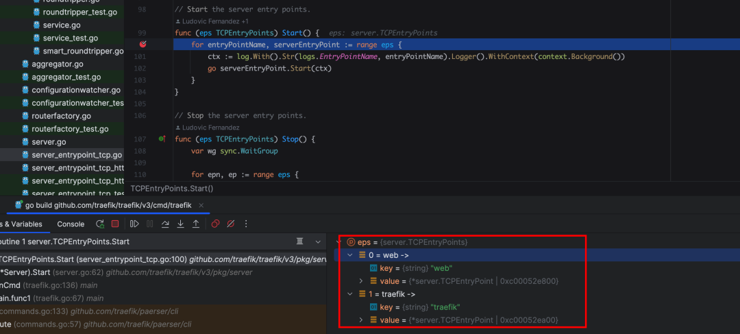 这里可以看到入口点默认是两个,一个是 traefik 自己默认的,另外一个是处理 web 请求的入口点,之后开启协程进入 serverEntryPoint.Start(ctx)。