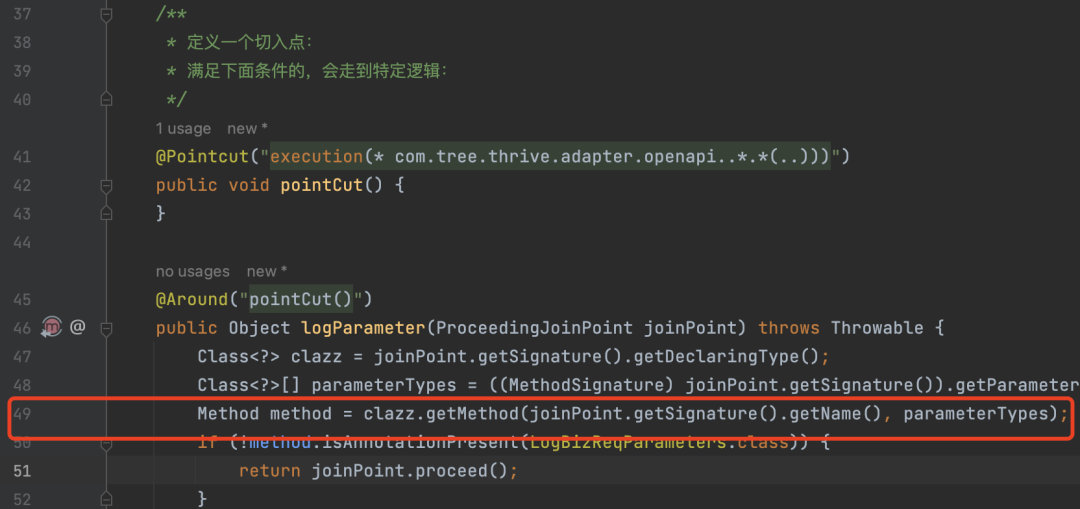 直接使用LogBizReqParameters.class作为切入点的筛选条件,可以减少不必要的筛选操作,提升性能。