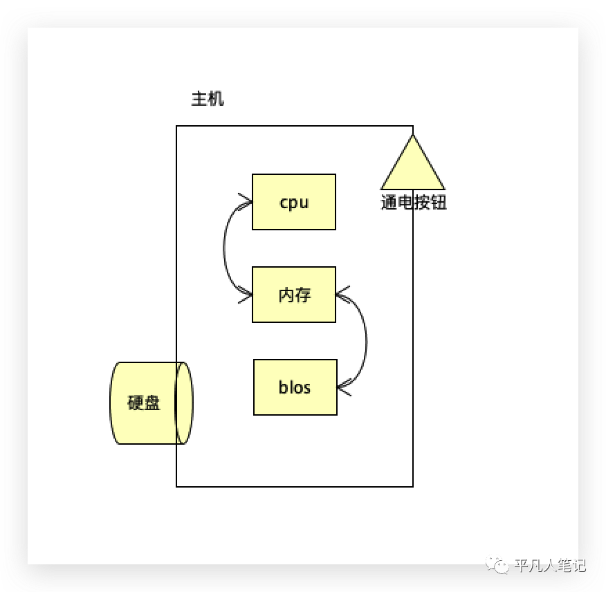 主机中包含内存、CPU、磁盘、主板上的blos,电源按钮等这些都是硬件,当接通电源的时候,blos就会把它的一段代码放入了内存当中,即内存中出现的第一个程序是blos,它里面有一些最基本的引导程序,假设跳过其他的引导,直接从磁盘中引导,磁盘中的第一个起始位置有一个分区表MBR(记录了磁盘分了几个区),blos会从磁盘的MBR中加载一段数据,从中找到C盘可引导分区,这个引导分区是被格式化的,文件格式有可能是FAT、FAT32、NTFS或其他的文件系统,这个分区前面埋了一个线性地址,比如linux的grud程序,grud程序会被blos加载入内存,grud程序中有一个驱动(代码),这个驱动可以识别文件格式,就可以读取文件系统,在文件系统中就会读取到第一个文件叫kernel(操作系统内核程序),kernel会通过引导程序被引导进入内存,这个时候kernel就占领了内存,给cpu发reset指令,让cpu从kernel这个空间的第一个位置开始加载指令,此时kernel就接管了操作系统,然后开始完成操作系统的初始化,比如启动ssh、bash、网络服务程序、tomcat等都是由kernel把程序一个一个启动起来。