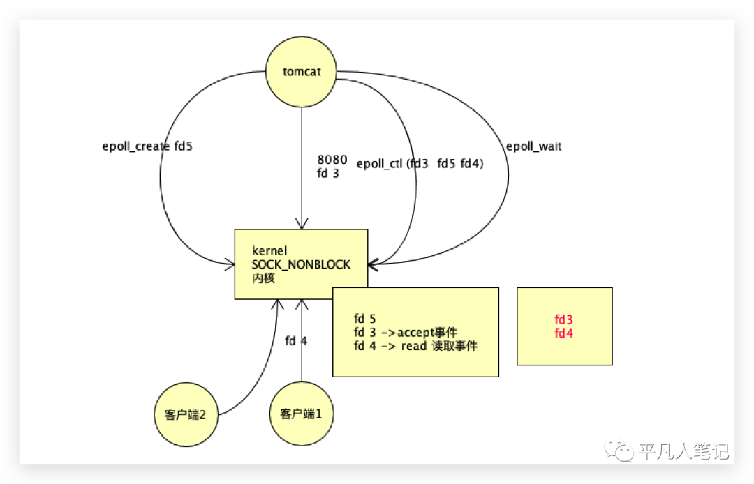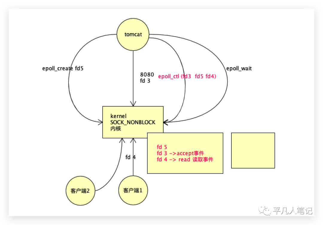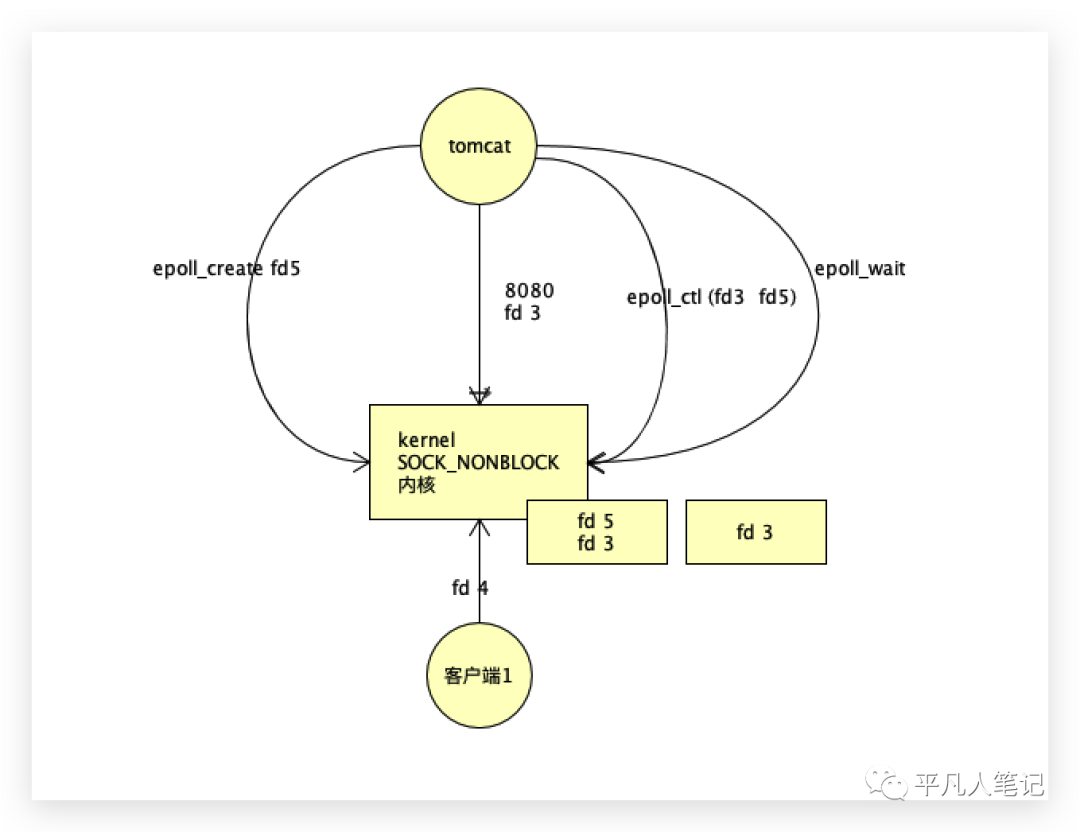 tomcat先去准备8080端口,得到一个文件描述符fd3,tomcat下一个指令是调用内核的epoll create,返回一个epoll的文件描述符,比如epoll的fd5,然后tomcat调用内核epoll_ctl,传入2个参数,一个是epoll的fd5,第二个参数是fd3。