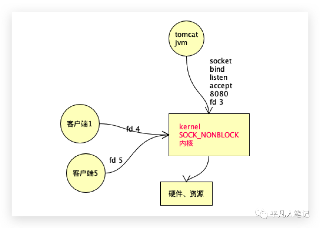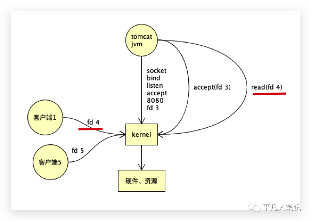 tomcat先是监听8080端口,比如得到一个fd3,来了一个客户端,到达内核说:我想和你建立连接。