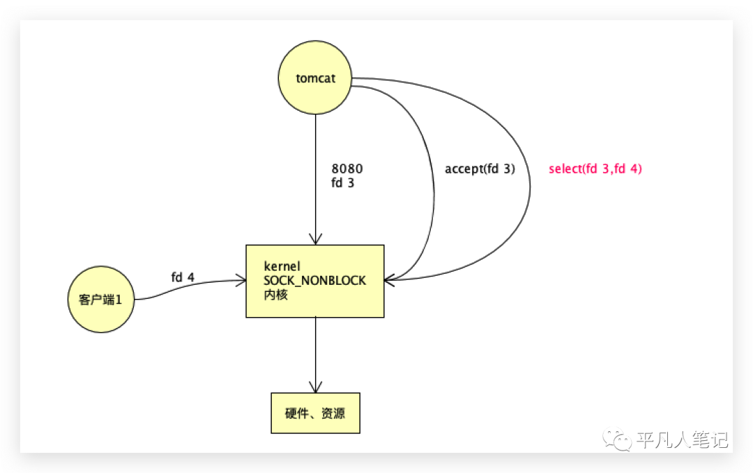 程序的一次循环里面调用select,内核对1000个文件描述符进行状态的判断并通过tomcat返回了这1000里面有几个状态是可读可写,最终由tomcat对select返回的可用的文件描述符发起read,读取还得由tomcat完成。