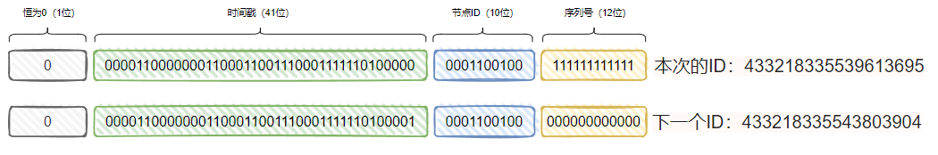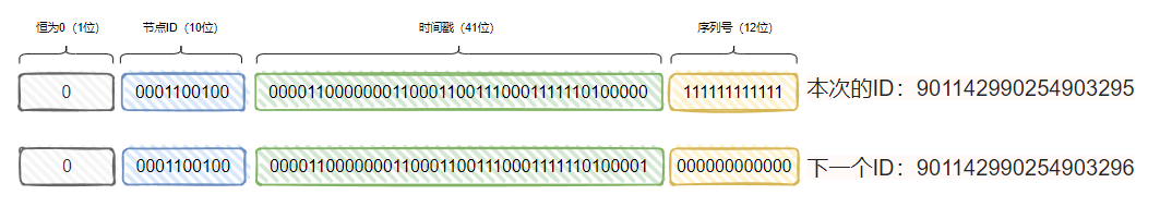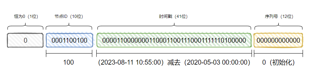 901142990254899200,就是节点 ID 为 100 的服务器在 2023 年 08 月 11 日 10 点 55 分 00 秒启动瞬间对应的初始化 ID。