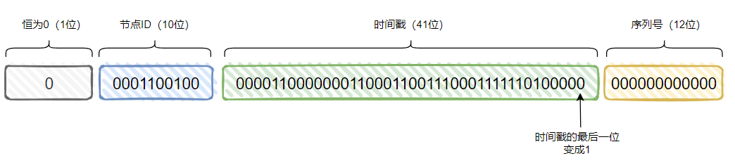 然后还是这一毫秒,还在继续申请 ID,那么序列号归 0,溢出位加到时间戳上,导致时间超前 1ms: