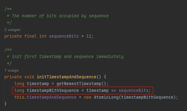 在程序里面的表现就是把时间戳左移 12 位,把序列号的位置给腾出来。