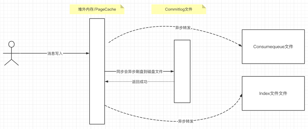 也就是说Commitlog文件转发到ConsumeQueue文件与客户端消息发送这两个步骤是异步的。即就算消息未及时转发,也不会影响消息发送的成功执行。
