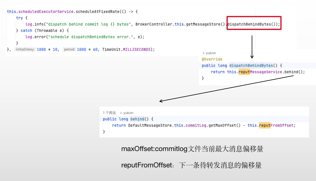 这段日志就是输出Commitlog中还有多少字节数未转发到Consumequeue和index文件,其计算逻辑如下图所示: