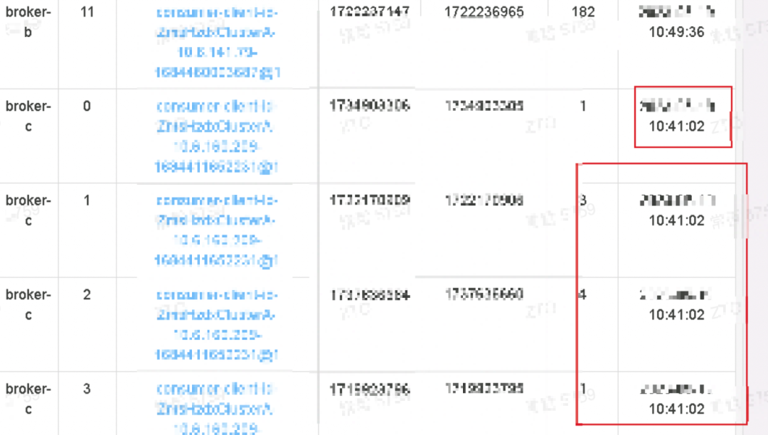 broker-c上的队列积压量在个位数, 但上一次消费的时间为202x-xx-xx 10:41:02,落后当前时间8分多钟,并且业务方明确表示在10:41到10:49会有大量消息发送。