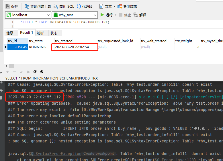 通过查询结果可以发现,在我们程序抛出异常之后,当前事务还在 RUNNING 状态: