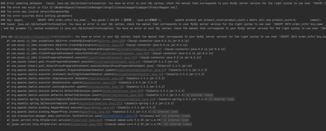 出异常了,肯定不应该有数据插入。我看了数据库,确实也没有新数据插入。