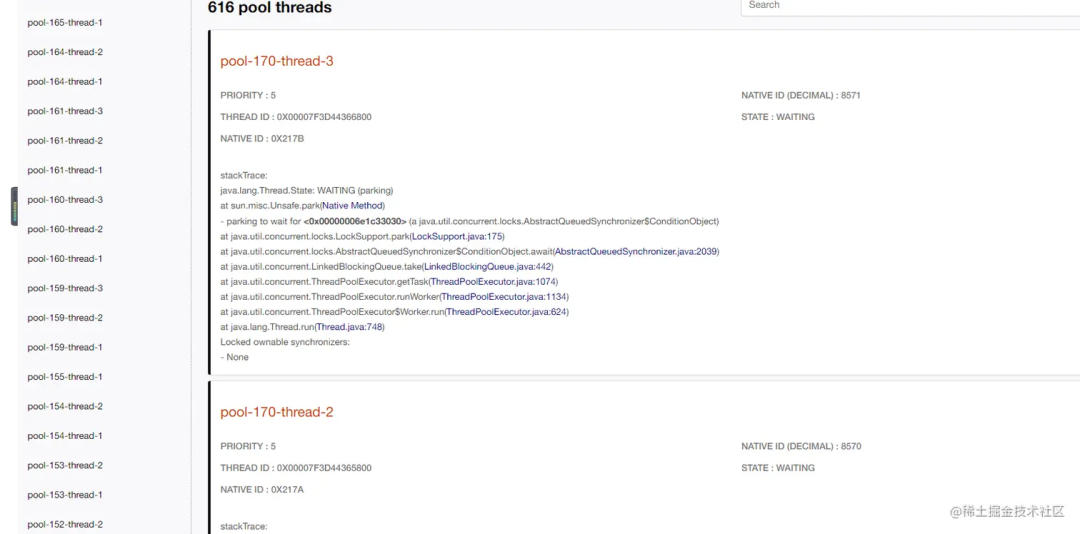 从线程分组看,pool 名开头线程占 616 条,而且 waiting 状态也是 616 条,这个点就非常可疑了,我断定就是这个 pool 开头线程池导致的问题。我们先排查为何这个线程池中会有 600+的线程处于 waiting 状态并且无法释放,记接下来我们找几条线程的堆栈观察具体堆栈: